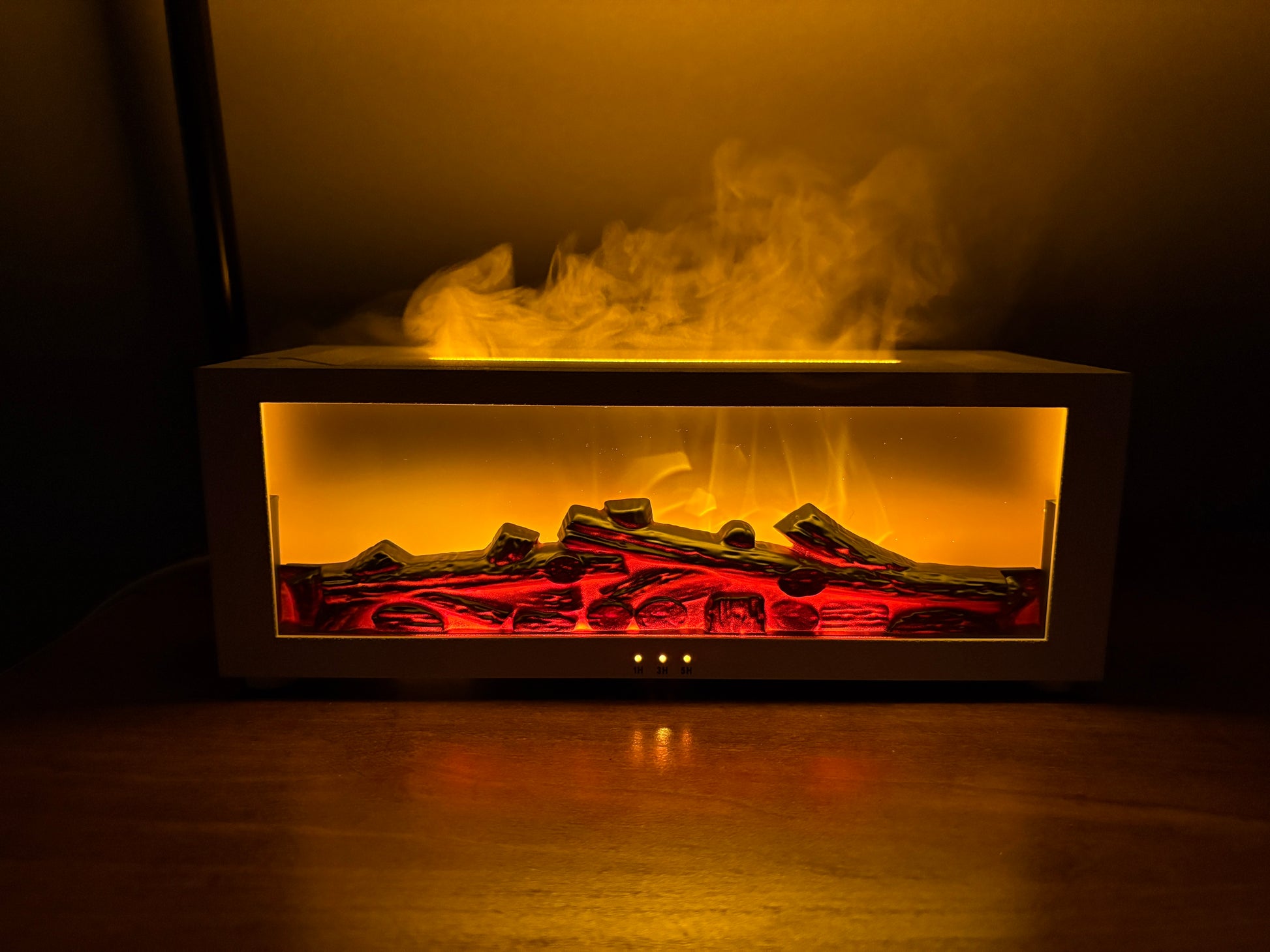 「FLAME FIREPLACE AROMA DIFFUSER」は、リアルな炎のようなLEDライトとアロマの香りで、心地よい癒しの空間を提供する超音波式加湿器です。